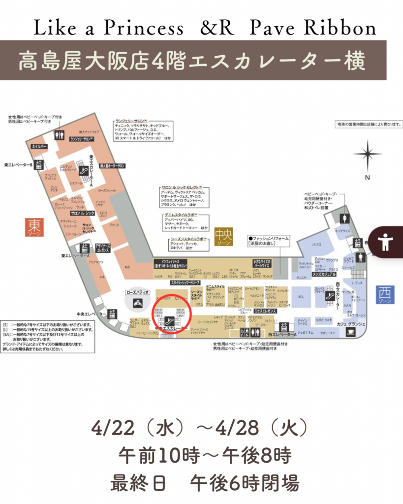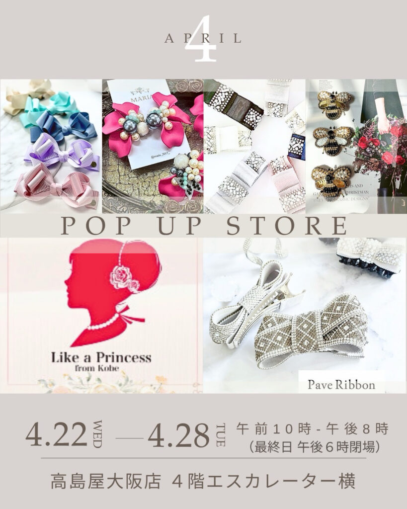 高島屋大阪店 出店のお知らせ POPUP2026.04.19 高島屋大阪店 出店のお知らせ Like a Princess &R Pave Ribbon コラボポップアップ開催 神戸発ブランド Like a Princess のお洋服と、 Pave Ribbon のリボンアクセサリーによる コラボレーションポップアップを開催いたします。 皆さまのお越しを心よりお待ちしております。 ⸻ ◾︎ 高島屋大阪店 4月22日(水)〜4月28日(火) 午前10時〜午後8時 [最終日 午後6時]